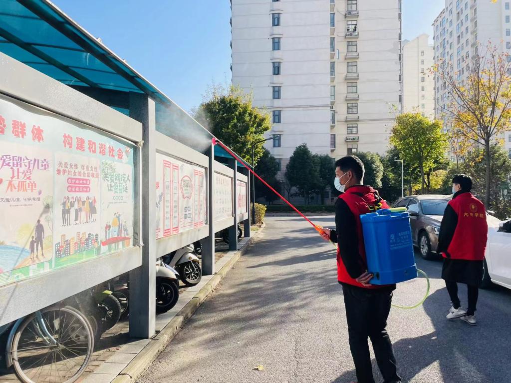 为了配合社区清除卫生死角和垃圾杂物,有效治理病媒生物孳生地,党员志愿者肩背消毒罐,对楼寓口、电梯厢、垃圾桶、道路两侧等地进行集中消杀。