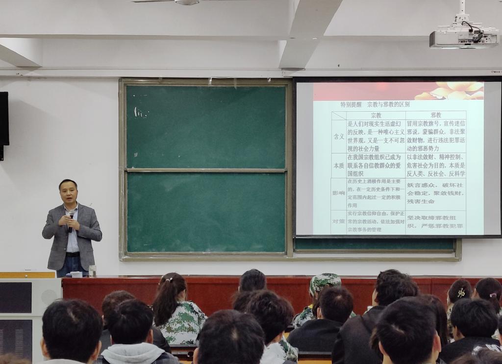 张礼涛从学习习近平总书记在2021年4月全国宗教工作会议上的讲话精神, 学习《宗教事务条例》,我国法律对宗教活动的规定, 在校园学习工作生活中如何对待宗教问题 四个方面阐述了宗教工作基本知识、宗教问题与宗教工作的意义和重要性。结合高校特点,对当前宗教政策、形势、热点问题和如何做好宗教工作进行了讲解。